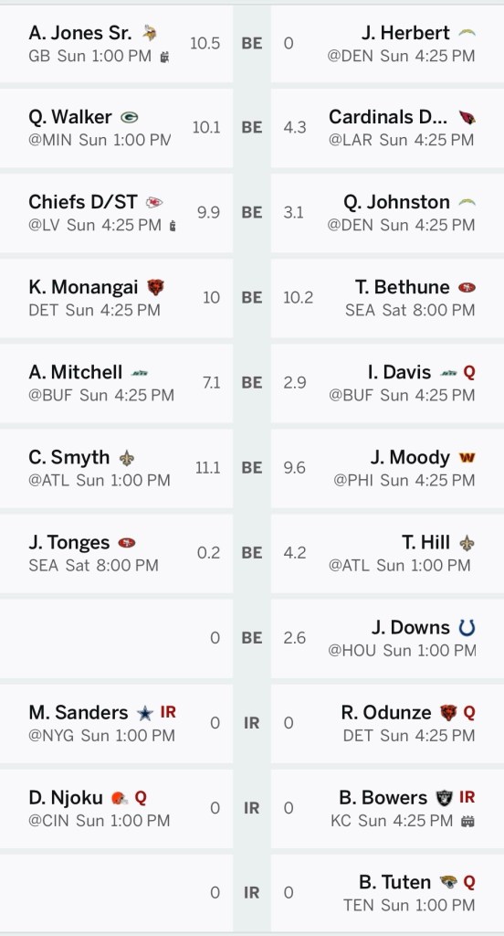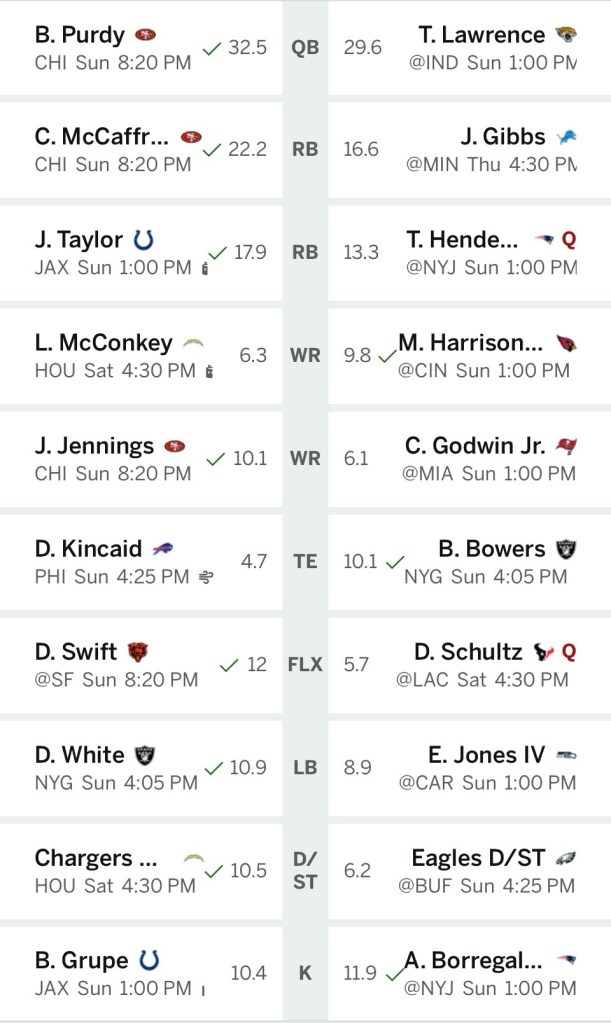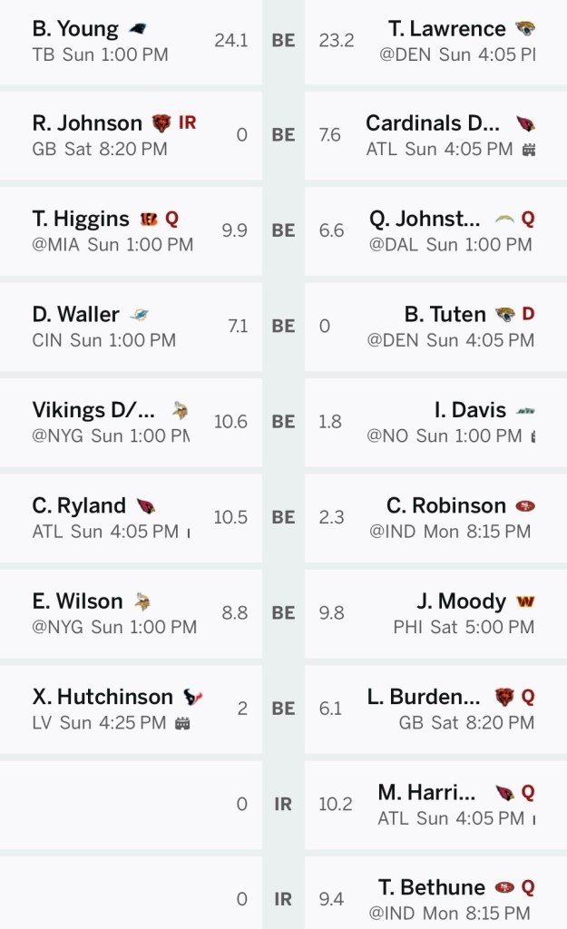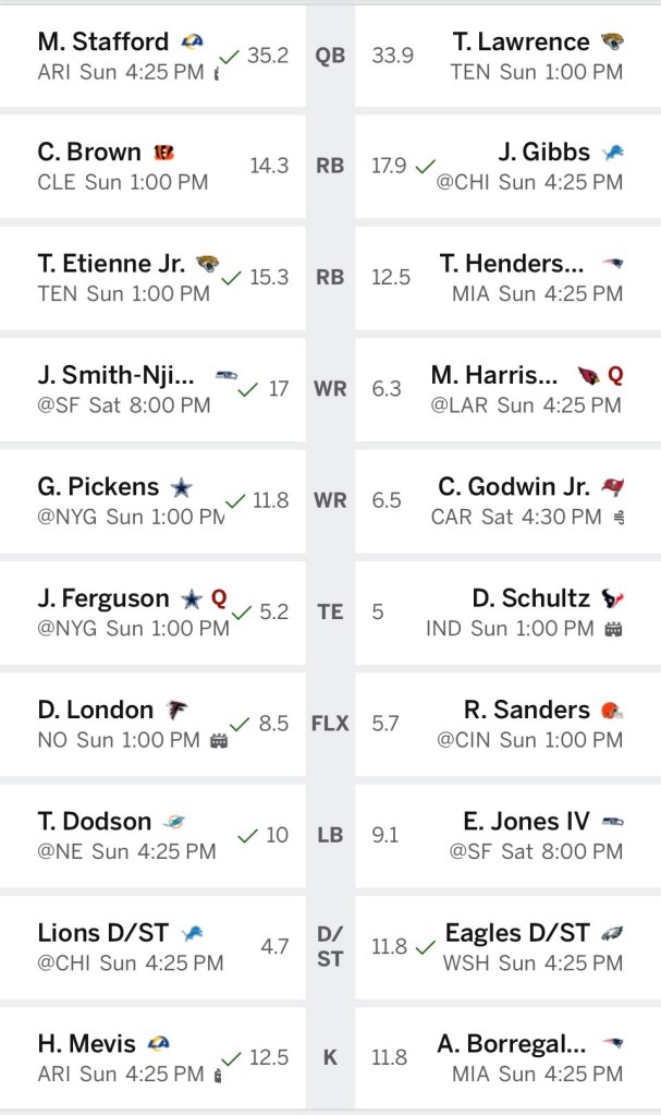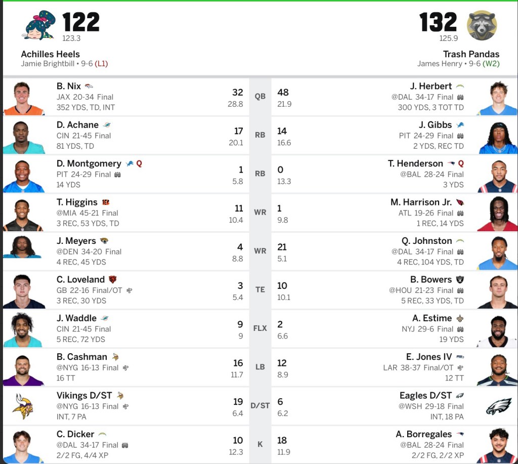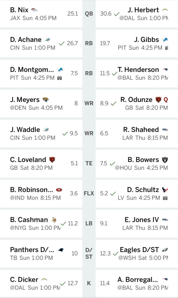 Wide receiver was an issue for me going into the week as my top two, Rome Odunze & Marvin Harrison Jr, both missed the previous game. Harrison was ruled out again, but Odunze was slated to go. Two minutes before kickoff, Odunze gets ruled out but he was already locked into my lineup. It could have been catastrophic, but ended up not hurting me, though I lost the WR battle, 34-8.