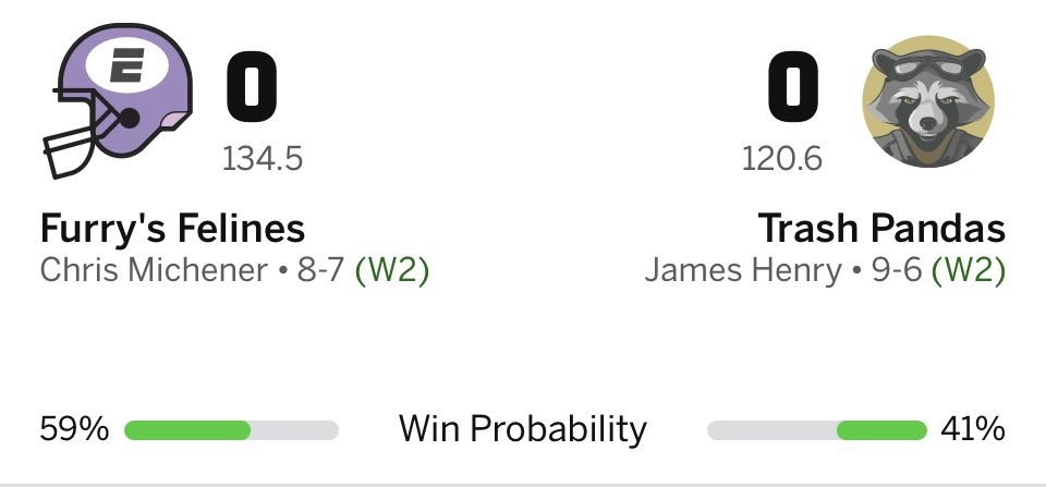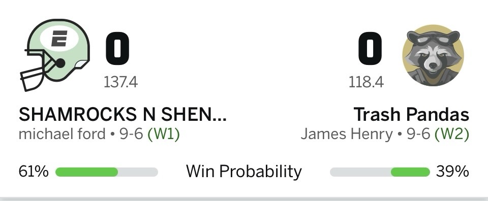This is projected to be another close one. I need to keep an eye on my receivers as I have injury issues with all of them.