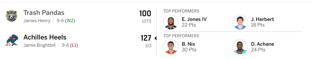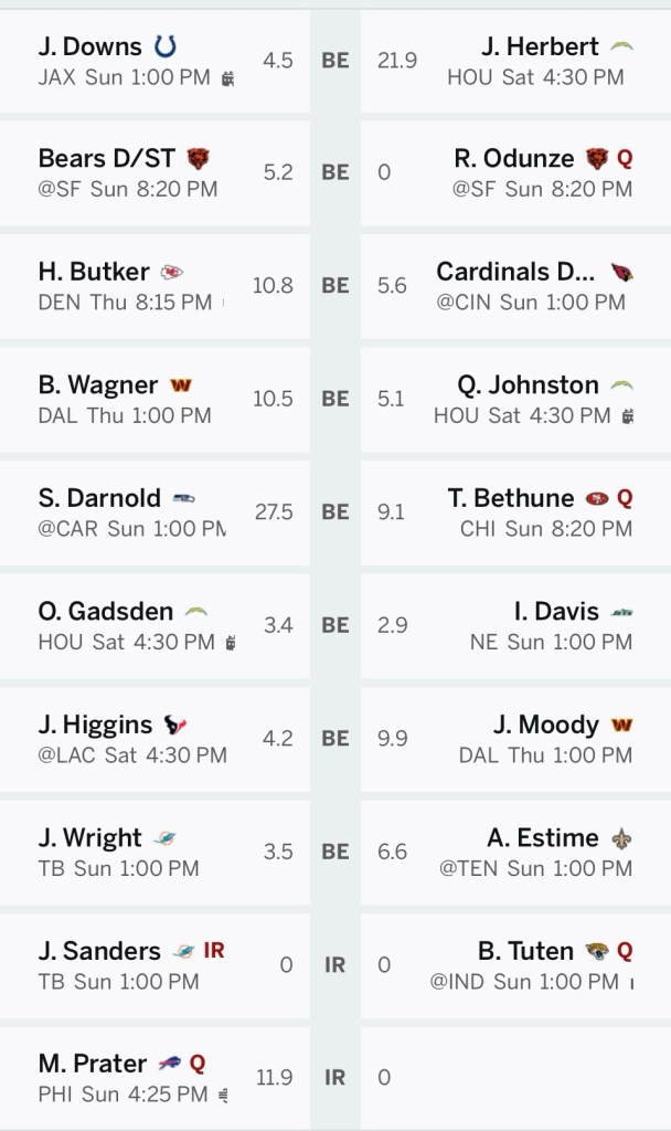 Because I was playing Herbert, and because Rome Odunze was out with an injury, I decided to put Herbert’s Chargers teammate, Quentin Johnston into my lineup and that is what ultimately led me to victory. Johnston put up 22 points and helped me win the WR battle by 7 points.