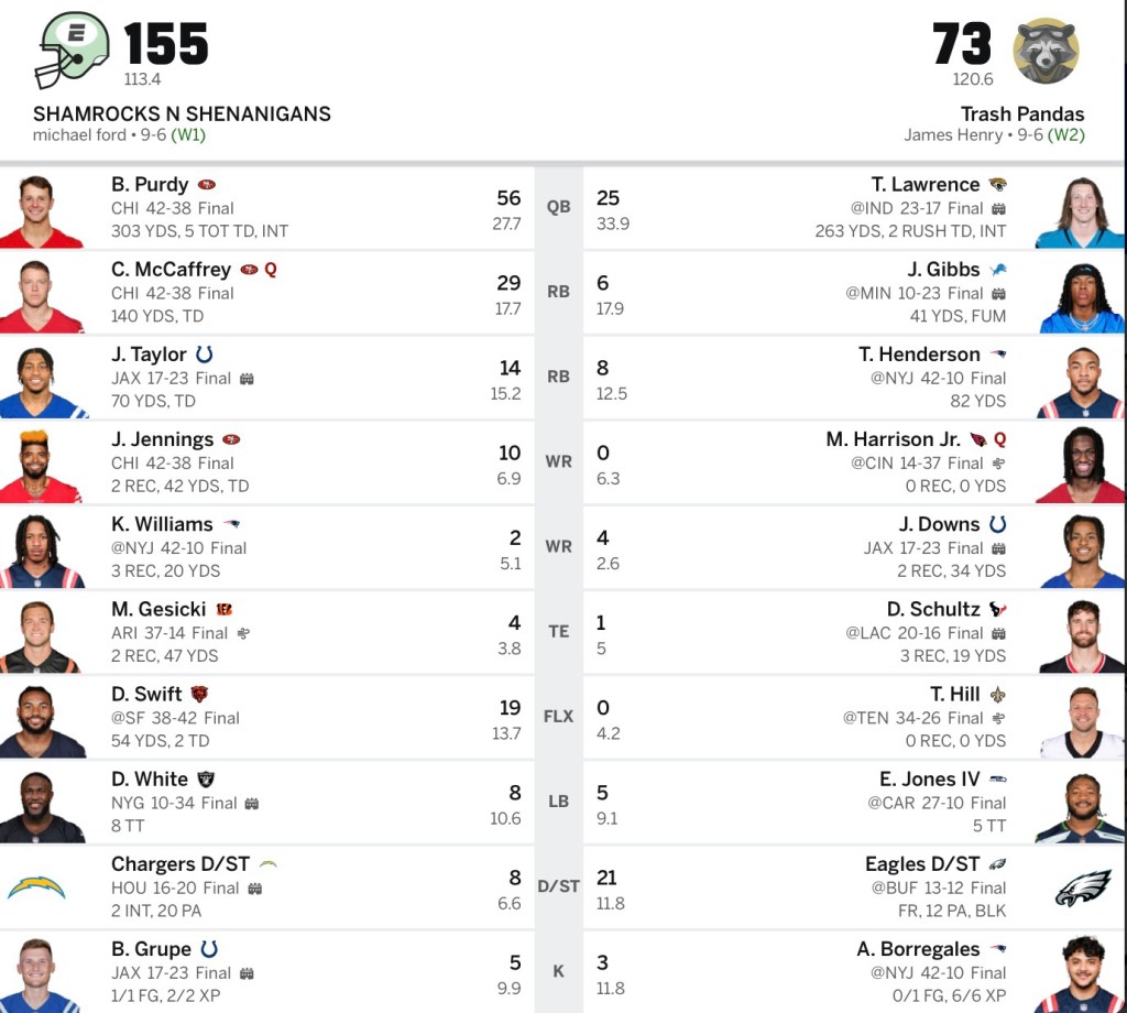 The TE battle was a bloodbath as Brock Bowers had a complete dud, while Pitts had a monster game. I lost this matchup, 41-4.