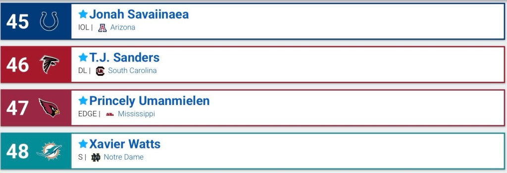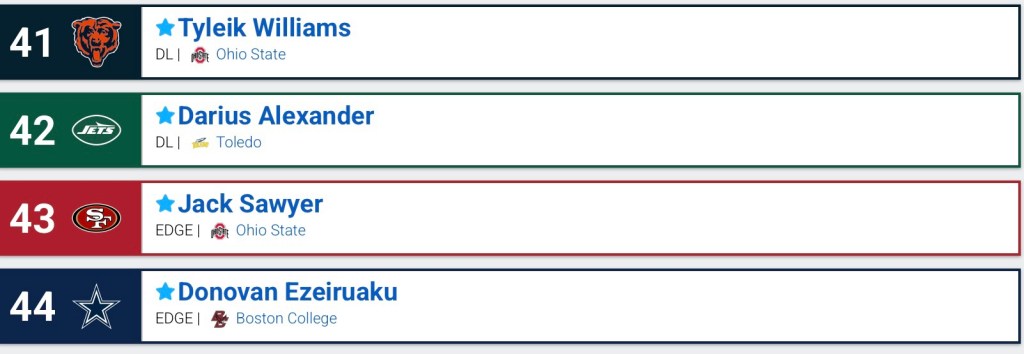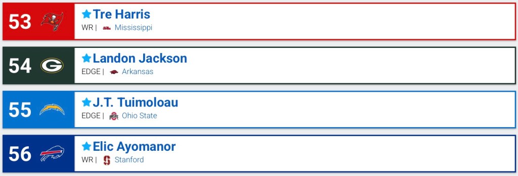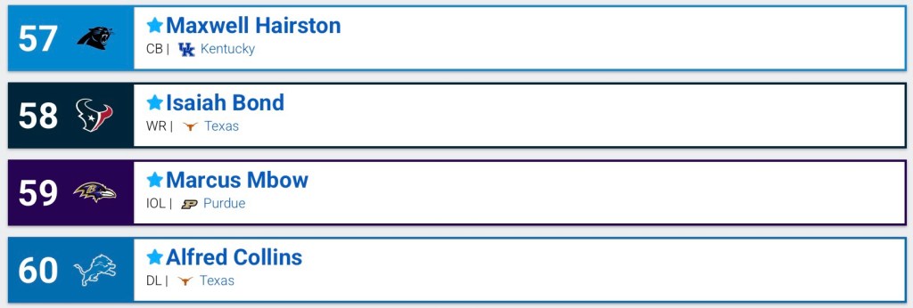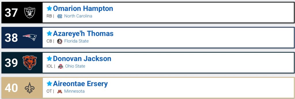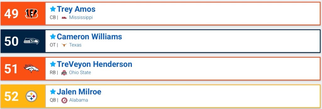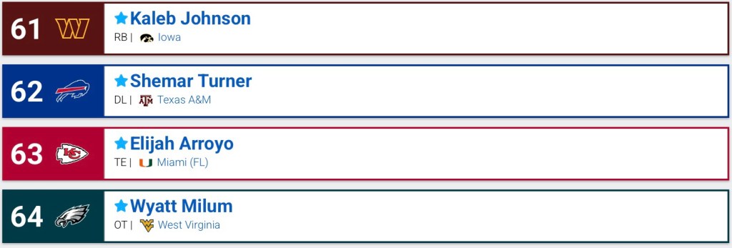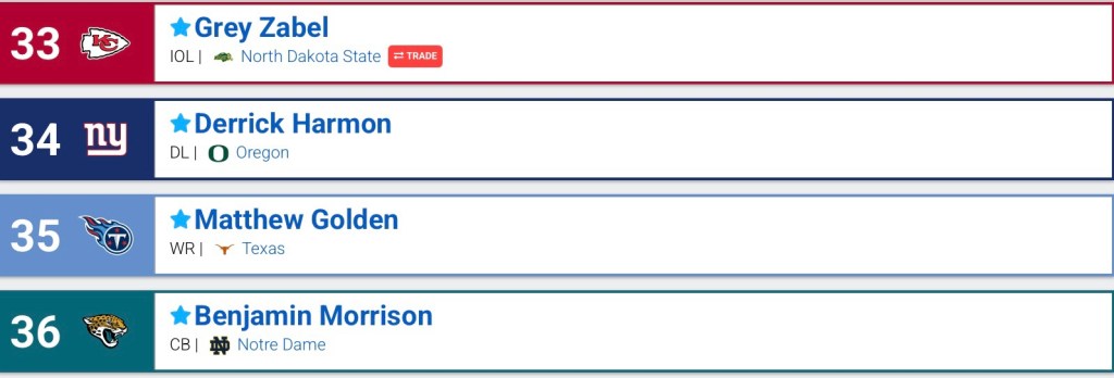 The Kansas City Chiefs land a versatile offensive lineman, who should be a first rounder, after trading out of the first. Tennessee gets their new QB a speedy weapon.The Las Vegas Raiders were a candidate to take Jeanty in the first round, they land their own workhorse back here. I have the Chicago Bears addressing their interior offensive line in free agency, here they round it out with another quality guard that’s shown the ability to kick outside to tackle in a pinch.The San Francisco 49ers and Dallas Cowboys both select edge rushers to pair with their superstar pass rushers.I think the Arizona Cardinals land a steal here. I love Umanmielen. The Miami Dolphins land a replacement for Jevon Holland.The Denver Broncos will likely lose Javonte Williams in free agency, they draft a replacement here. As I mentioned earlier, I have the Pittsburgh Steelers re-signing Justin Fields as their starting QB, but I think it’ll be a short term deal that’s easy to get out of if things don’t work out. Milroe is a hedging of their bet.The Green Bay Packers land an edge rusher I really like (dammit!). The Los Angeles Chargers take an edge that Jim Harbaugh saw plenty of at Michigan.The Carolina Panthers add the fastest cornerback in the draft. The Houston Texans add to their receiving corps.Brian Robinson has been decent for the Washington Commanders, but Johnson is a clear upgrade. Travis Kelce will be back for at least one more season, but the Kansas City Chiefs need a succession plan.