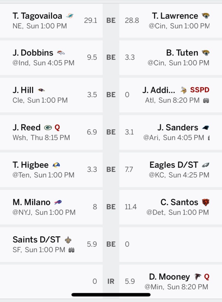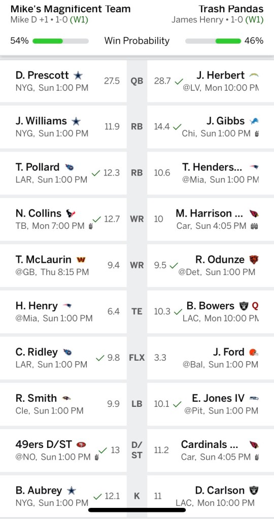 I think the keys for me this week are 1) Getting more production out of my RBs, especially Jahmyr Gibbs. 2) Brock Bowers continuing to make TE a dominant position for me. 3) My flex play getting closer to double digit points.