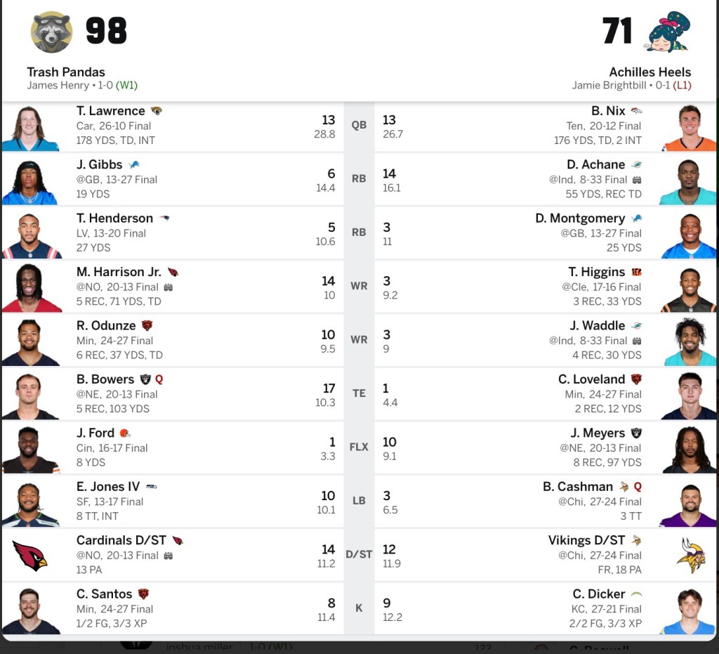 The MVP of week one, however, was Brock Bowers, who put up 17 points, despite exiting the game with an injury and not scoring a touchdown. I outscored my opponent’s tight end by 16.