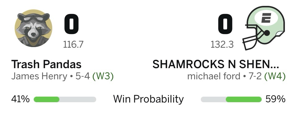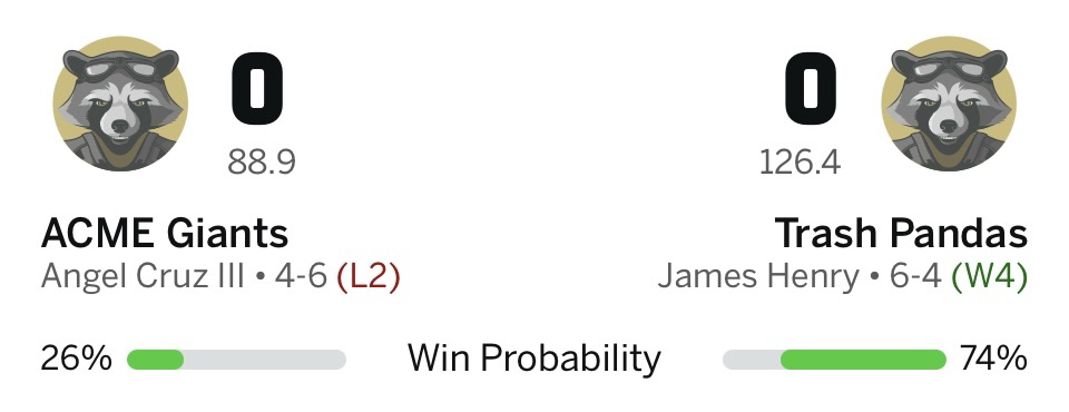 Huge matchup this week. My opponent has been one of the best teams in the league this season, powered by the best running back tandem in the league. I’ll need to be at my best to keep my momentum going.