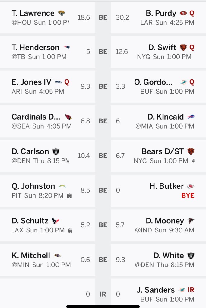 Jahmyr Gibbs: Gibbs was terrible last week and I cannot afford a repeat of that. My opponent trots out Jonathan Taylor & Christian McCaffrey. I have little to no chance of winning the running back duel, but Gibbs can keep it from being a total embarrassment.