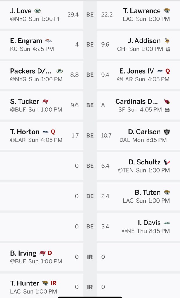 These lineups could look very different come Sunday. My opponent will hit the waiver wire for a kicker and probably make a QB change and possibly a few others.
