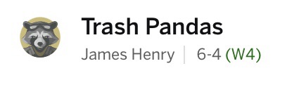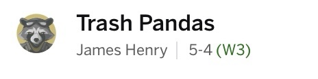 The Trash Pandas have won four in a row and it would take an epic collapse for me not to make the playoffs. I do have to worry about my QB1 going on bye in a couple weeks, but this team is starting to click.