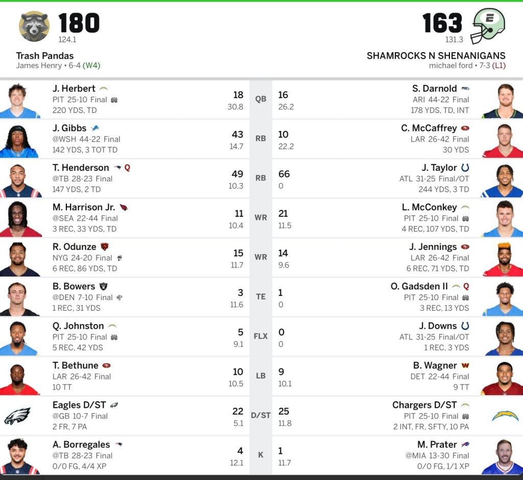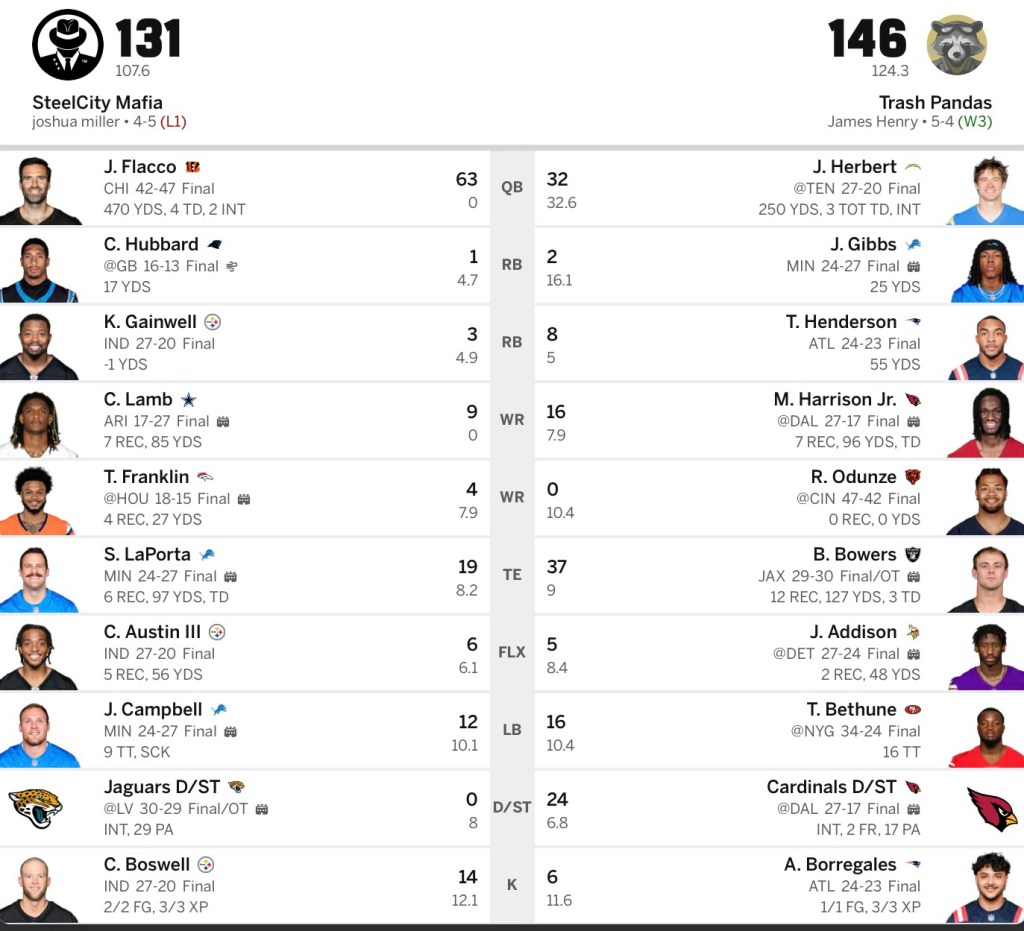 I thought I had an advantage at QB with Justin Herbert. Herbert was very good, but Joe Flacco nearly doubled him up.