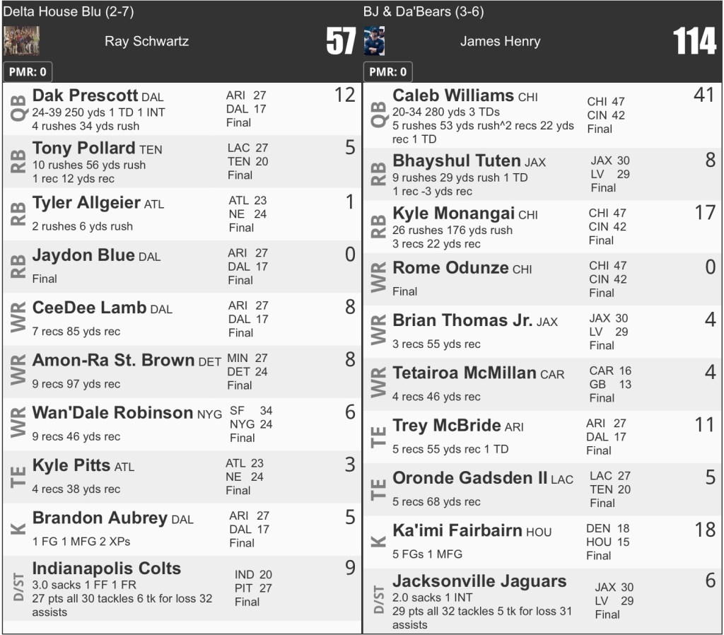 Caleb Williams was solid, putting up 22 points, but it could have been even better. Bears receivers had at least 6 drops, two of which should have been touchdowns. I lost the QB battle by 7 points.