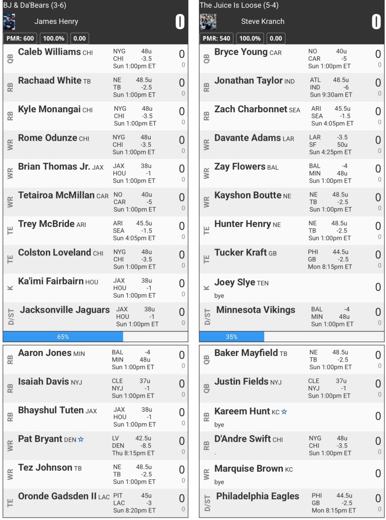 Rome Odunze: Odunze has been up and down, lately. I need him to string together two consecutive good performances. I have a clear advantage, on paper, at WR, I need to capitalize on that.
