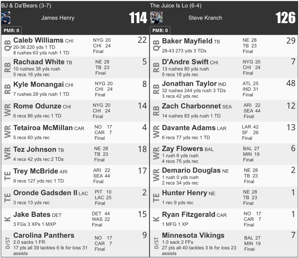 Rome Odunze bounced back from being shutout a week ago, scoring his first touchdown since week 4. Tez Johnson was an emergency start due to injuries and he scored two touchdowns. I won the WR battle, 36-21.