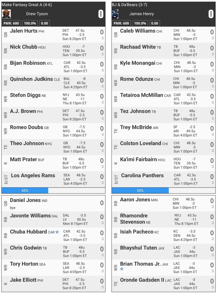 Jahmyr Gibbs had, perhaps, his worst fantasy performance of his career and Rome Odunze got completely shut out. Those two and Joe Flacco put me in a hole I didn’t think I had a chance to crawl out of.